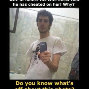 At first glance, this photo looks like a casual bathroom selfie. But something about it made the wife immediately suspect her husband of cheating! Can you figure…