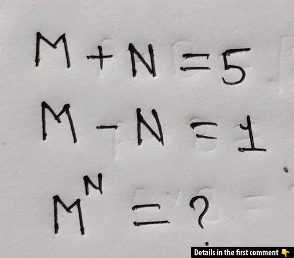 Math puzzles like this one look simple—but they love to trip you up. Take a moment to study the image above: two basic equations involving M and N, then an exponentiation problem at the end. Before you scroll down for the answer, give it your best shot and share your guess in the comments. Ready to see if your algebra skills are sharp enough?