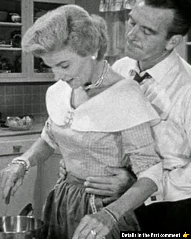 A heartwarming moment from Leave It to Beaver, where June Cleaver, played by Barbara Billingsley, is lovingly kissed on the forehead by her husband, Ward Cleaver, portrayed by Hugh Beaumont