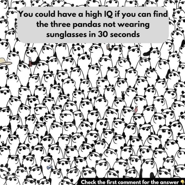 Challenge your observation skills with this tricky puzzle! In the image, there are many pandas wearing sunglasses, but there are three who are not. Can you spot them in just 30 seconds? It might sound easy, but the details can make this challenge more complex than you think. Get ready to test your IQ and share your answer in the comments!